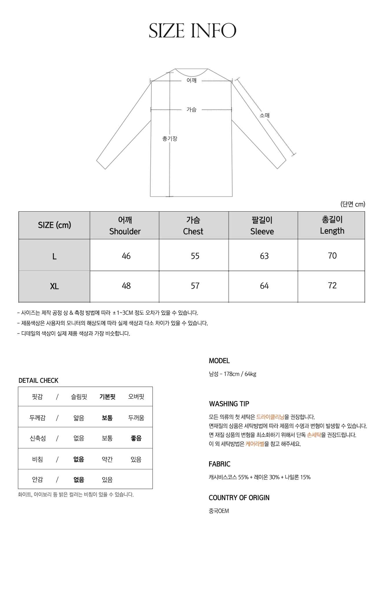 손세탁시 미지근한 물에 중성세제로 누르 듯이 단독 세탁해주세요. 기계세탁은 뒤집어서 망에 넣고 울 코스로 단독 세탁 해주세요. 비틀어 짜지 말고 가볍게 물기 제거 후 그늘진 곳에 뉘어서 자연 건조해주세요. ※ 금지사항 : 삶기 X 건조기 X 비틀기 X 표백제 X
