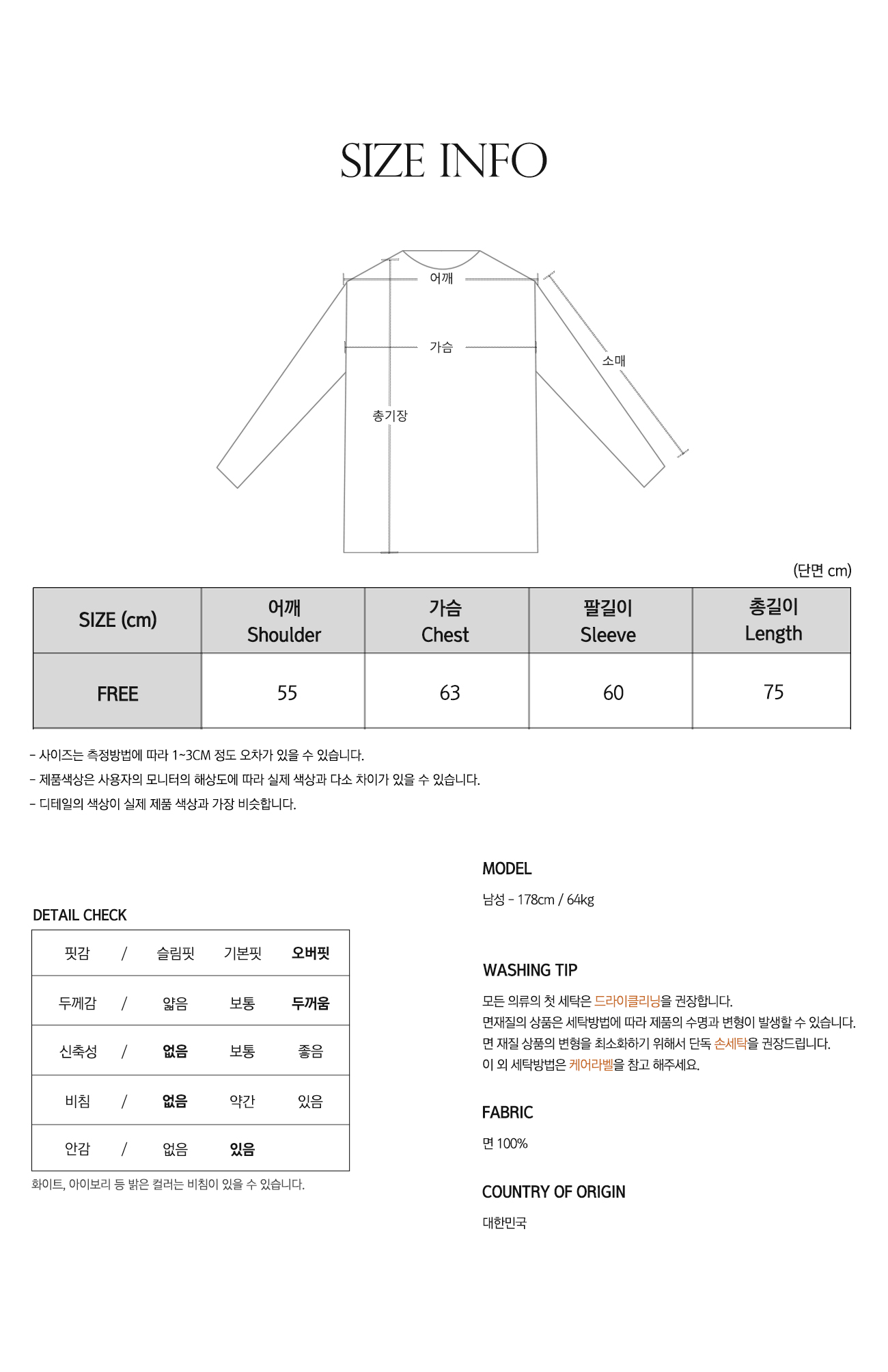 손세탁시 미지근한 물에 중성세제로 누르 듯이 단독 세탁해주세요. 기계세탁은 뒤집어서 망에 넣고 울 코스로 단독 세탁 해주세요. 비틀어 짜지 말고 가볍게 물기 제거 후 그늘진 곳에 뉘어서 자연 건조해주세요. ※ 금지사항 : 삶기 X 건조기 X 비틀기 X 표백제 X