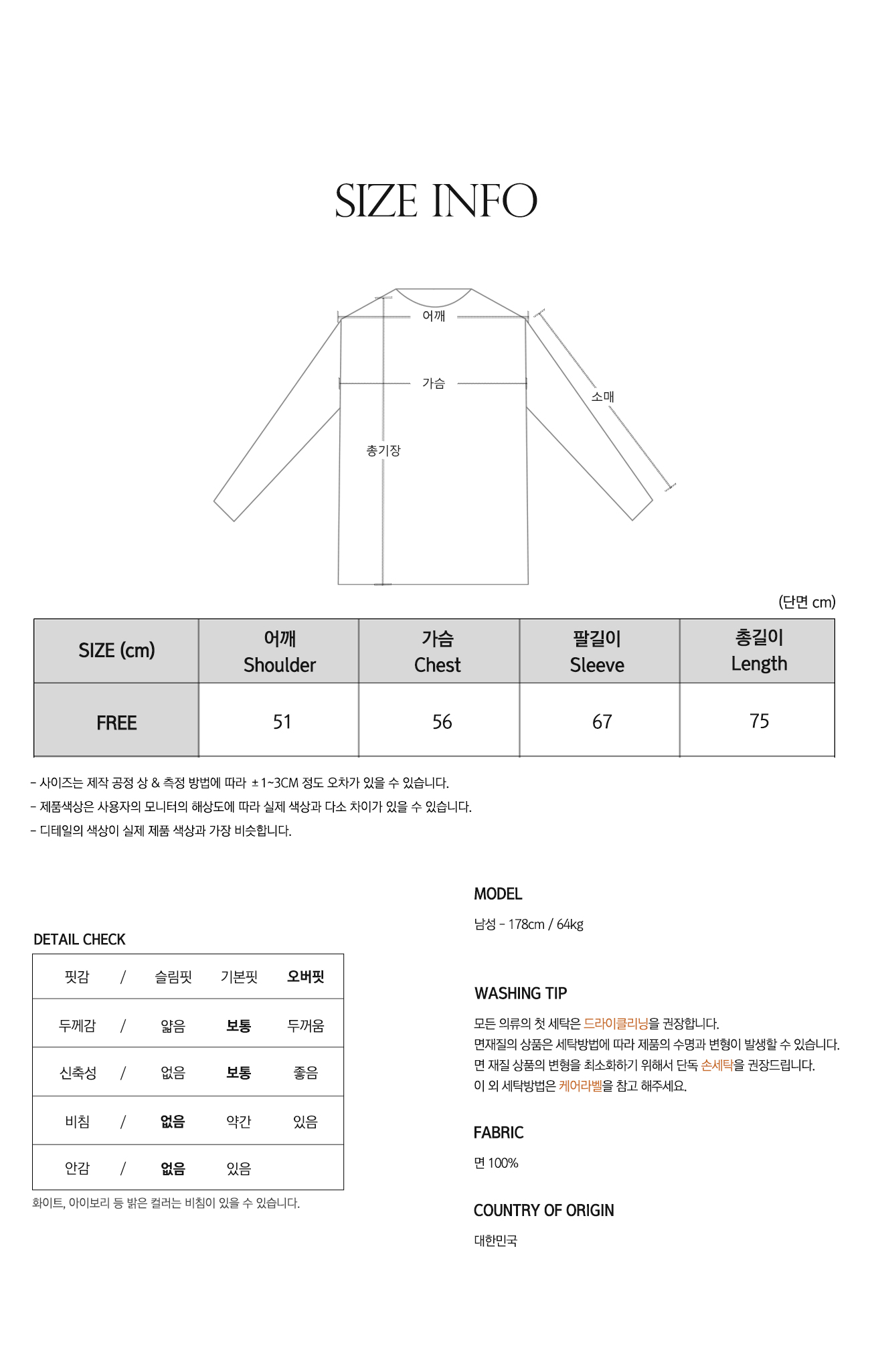 손세탁시 미지근한 물에 중성세제로 누르 듯이 단독 세탁해주세요. 기계세탁은 뒤집어서 망에 넣고 울 코스로 단독 세탁 해주세요. 비틀어 짜지 말고 가볍게 물기 제거 후 그늘진 곳에 뉘어서 자연 건조해주세요. ※ 금지사항 : 삶기 X 건조기 X 비틀기 X 표백제 X