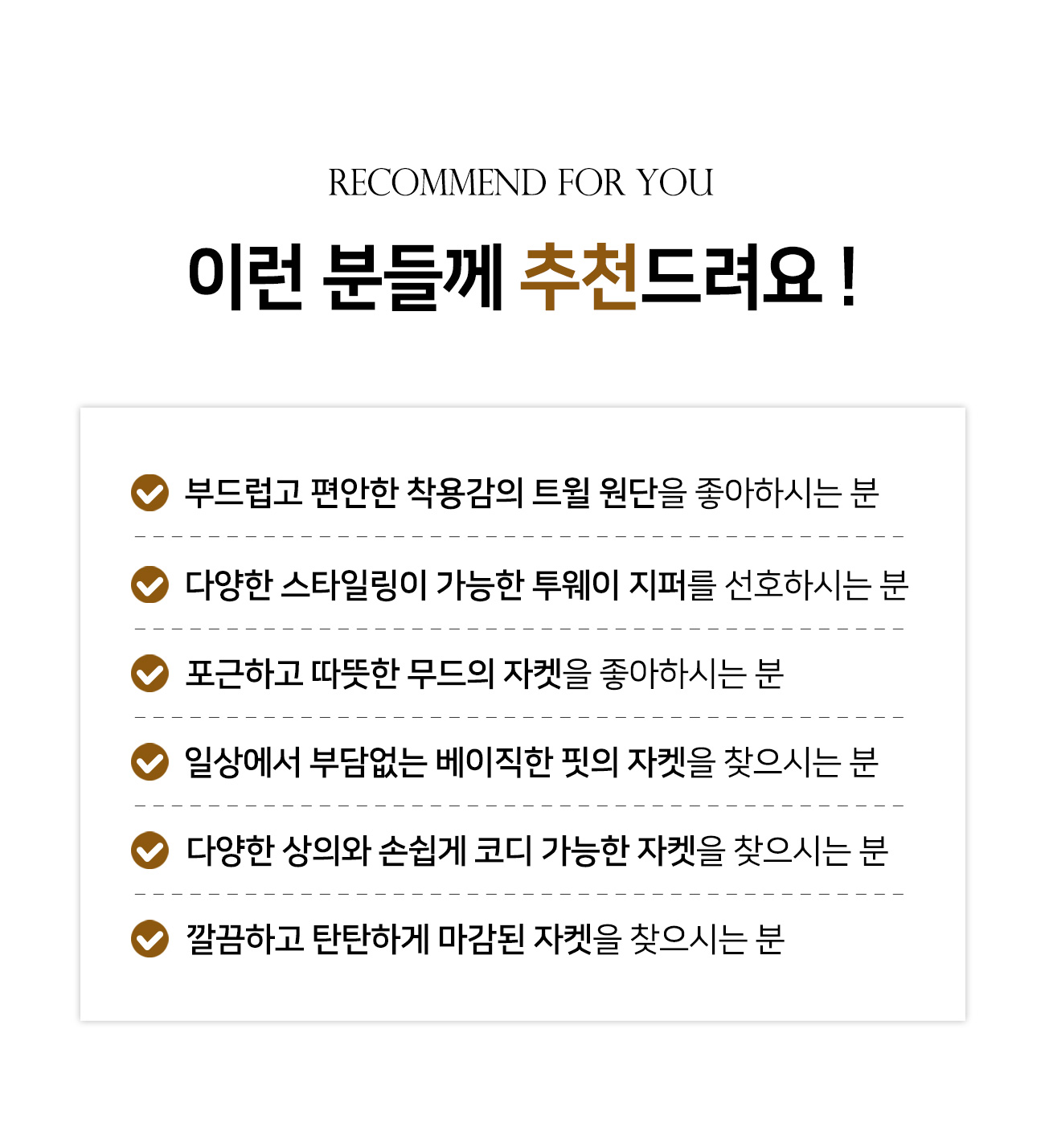 - [ex:심한구김 / 담배냄새등의 악취 / 탈취제 또는 향수 사용 / 착용 후 외출 / 원단훼손 등]